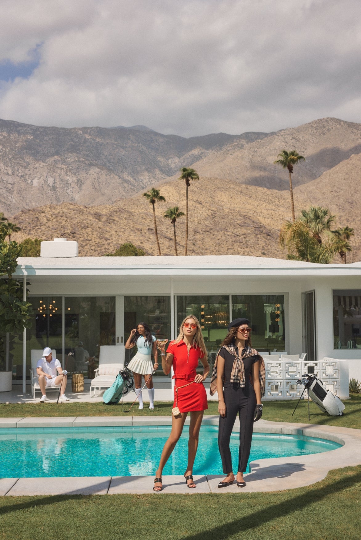 A homage to Slim Aaron’s iconic photograph, ‘Poolside Gossip’, this golden era depicts the laissez faire lifestyle of 1970s Palm Springs. Friends stylishly dressed catching up around the pool, with a cocktail in hand, surrounded by palm trees and mid century modern architecture. Frequent visits to the racquet club and morning tee times at the golf course.